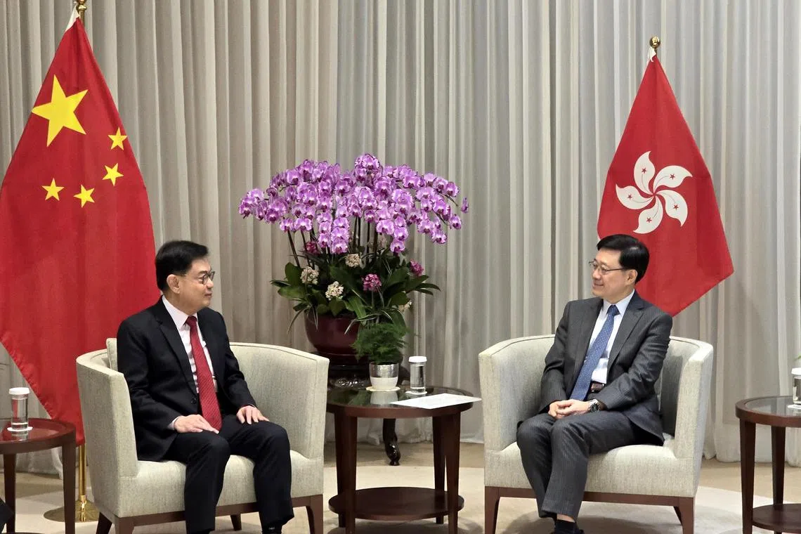 DPM Heng Swee Keat (left) meeting Hong Kong Chief Executive John Lee in Hong Kong on April 12.