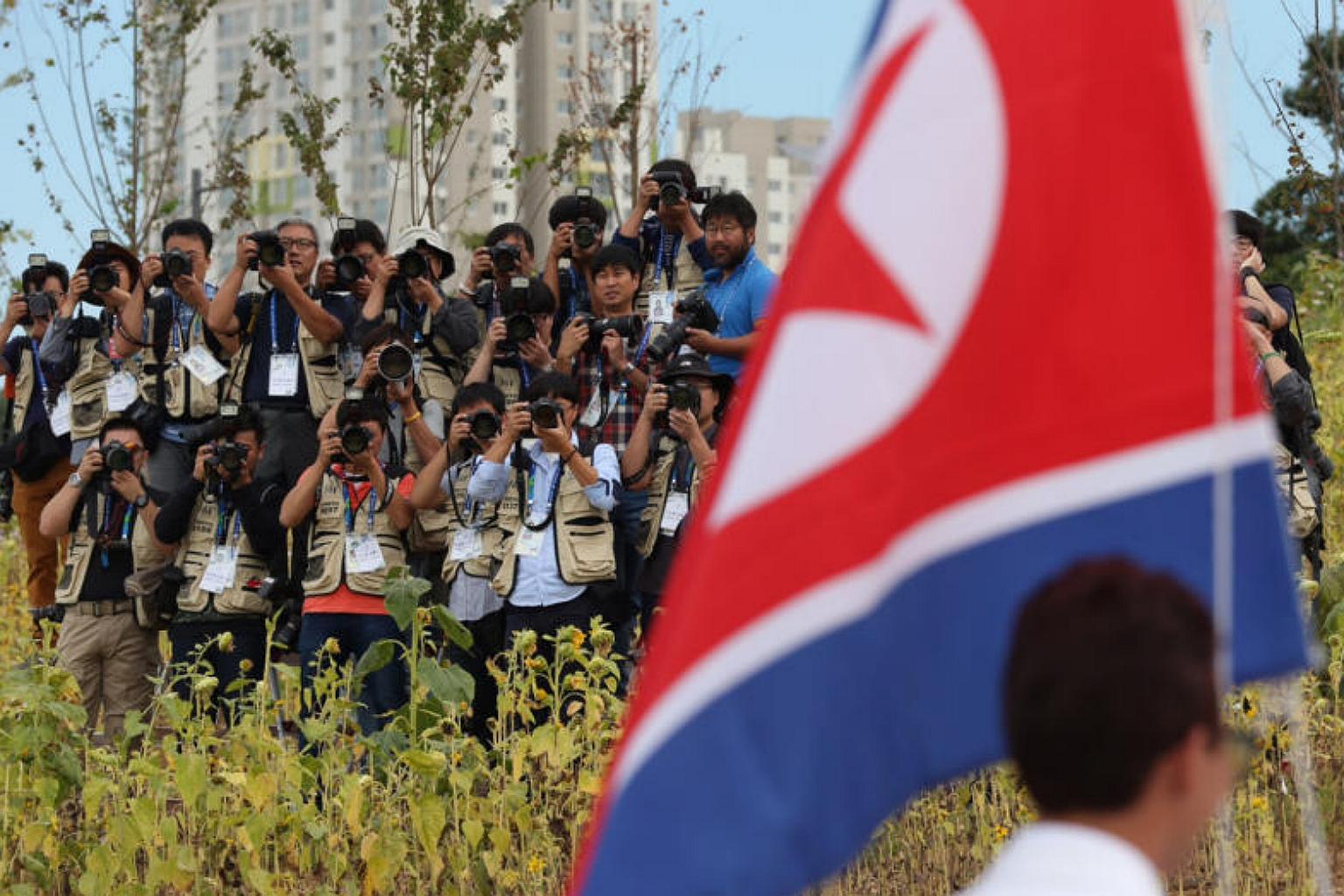 Photographers stake their positions on a hill to get the best shots of the North Korean flag being raised during the team welcome ceremony for the 17th Asian Games Incheon 2014.