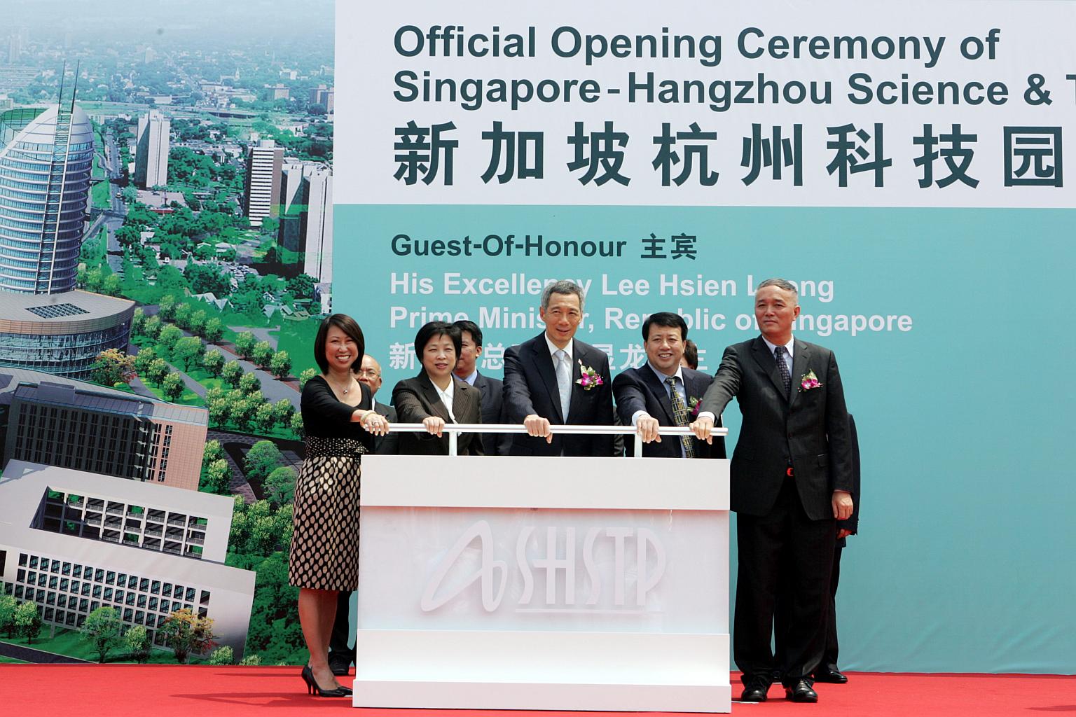 Prime Minister Lee Hsien Loong officiating during the opening ceremony for the Asendas Singapore Hangzhou Science and Technology Park with Hangzhou Mayor Cai Qi (right) and other dignitaries, on June 5, 2009.