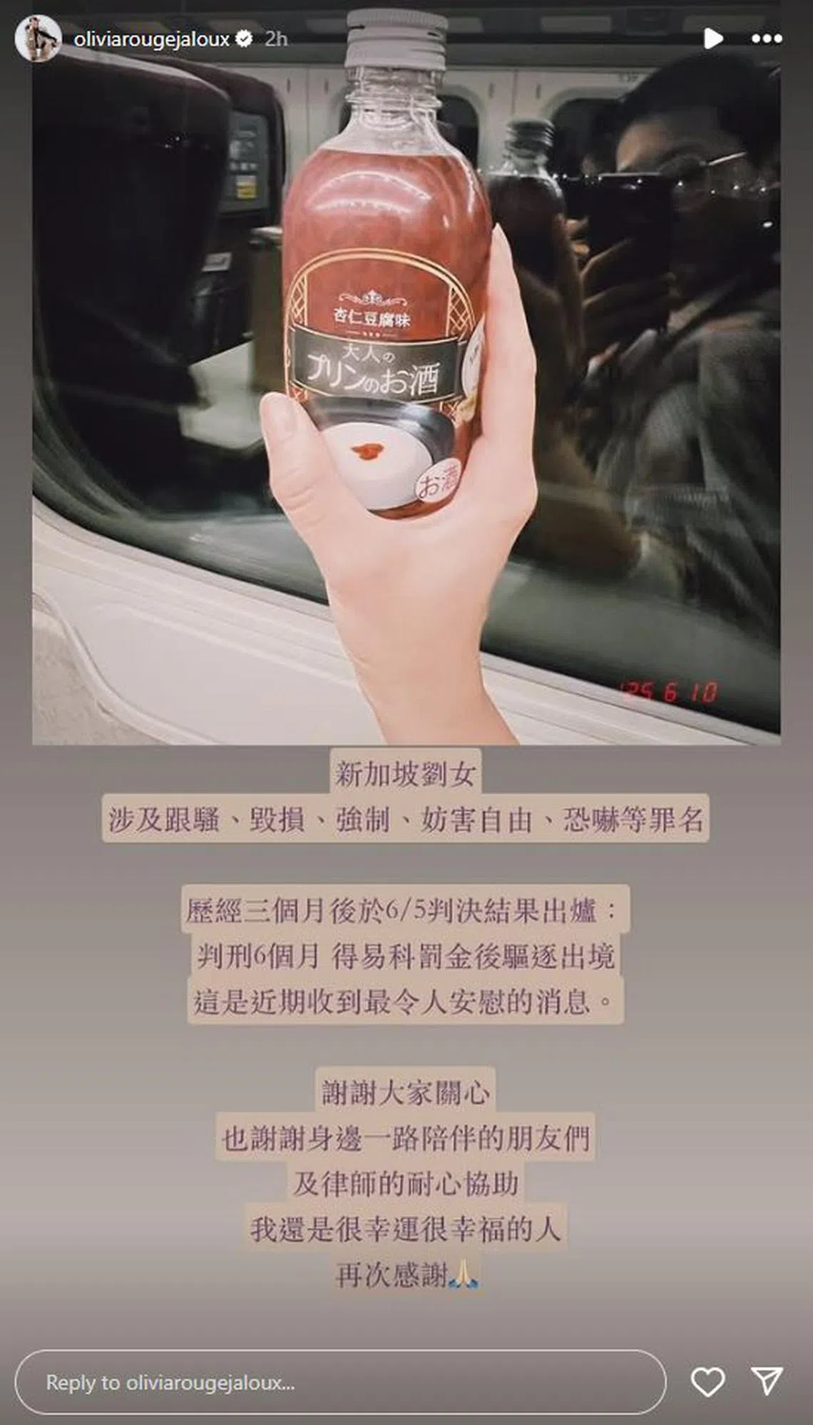 Singer Olivia Tsao posted her relief after the judgment was passed.