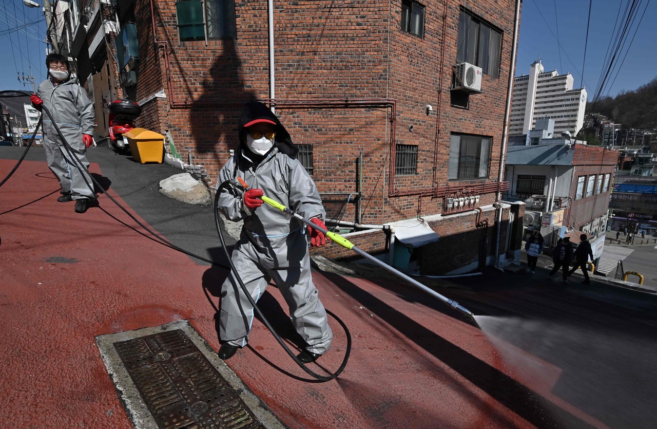 A worker wearing protective gear sprays disinfectant near a building in Seongnam, South Korea, on March 16, 2020.