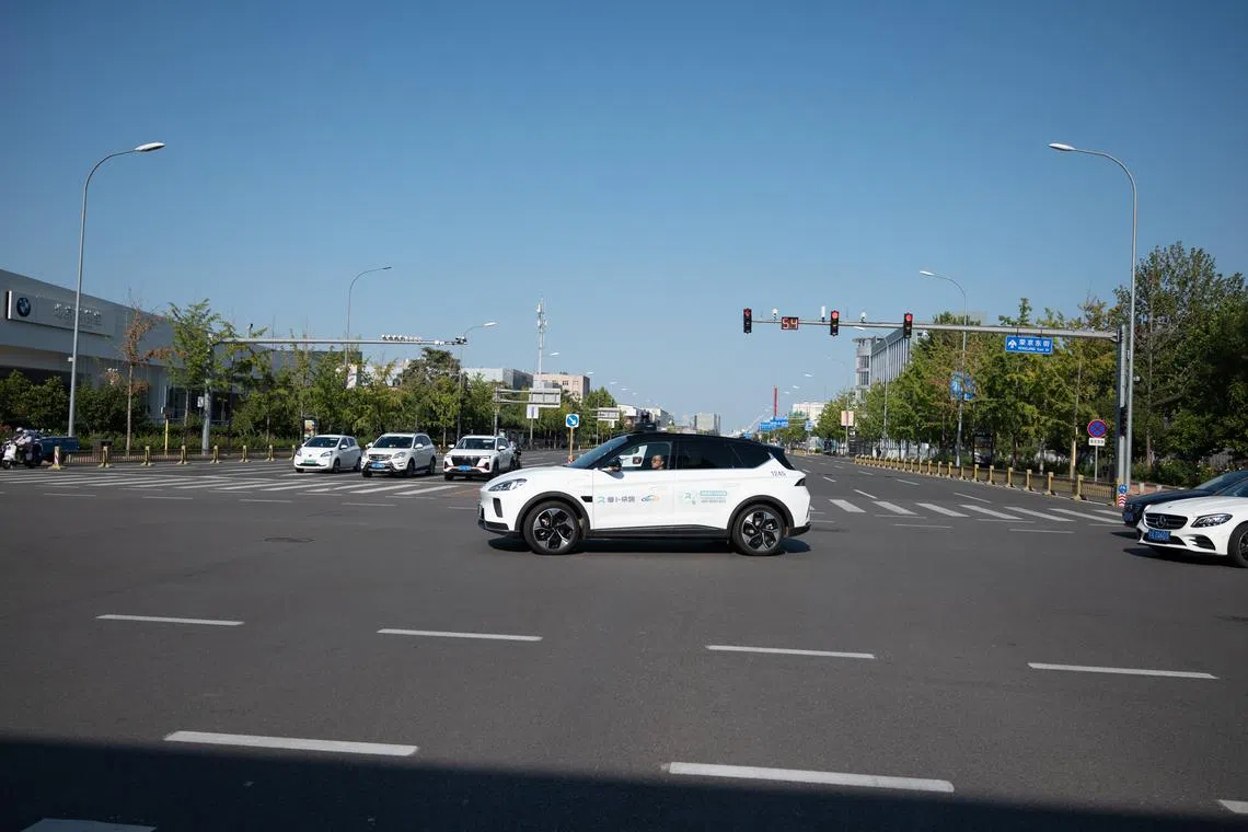 A ‘robotaxi’ with a safety officer on board in the Beijing suburb of Yizhuang, a test bed for autonomous vehicles.