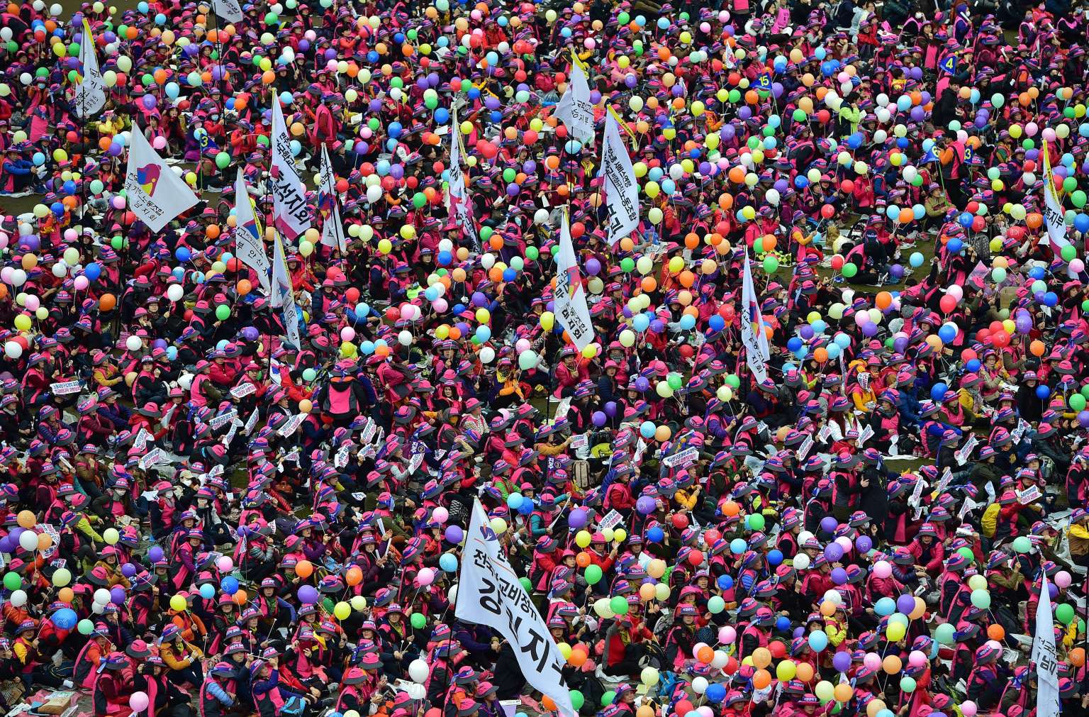 South Korean protestors stage a large rally against the government outside the City Hall in Seoul on Nov 14, 2015.