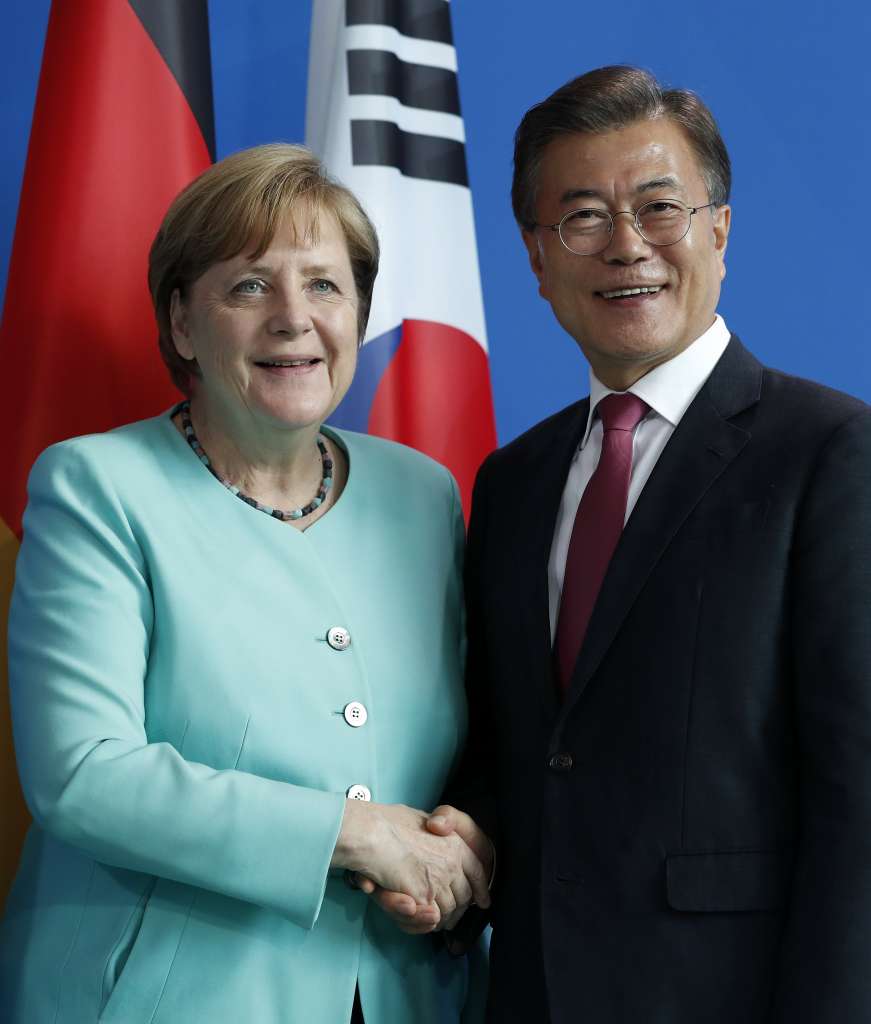 Moon (right) and Merkel at their joint press conference, July 5, 2017.