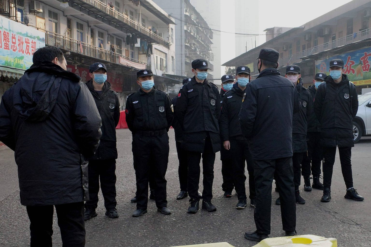 Officials at the Huanan market, where a man who died from a respiratory illness had purchased goods from, in Wuhan, China, on Jan 11, 2020.