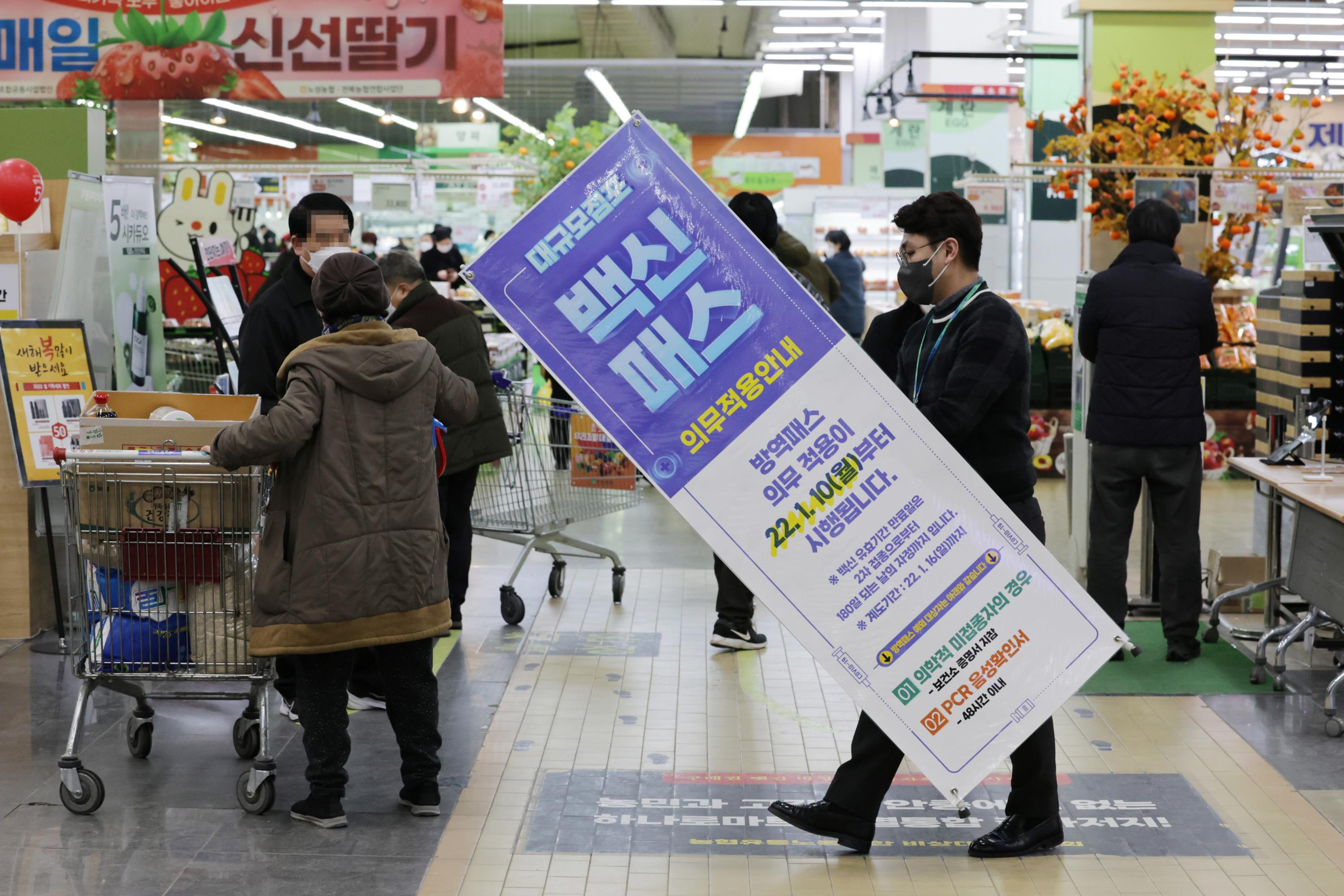 A clerk removes a notice on the government's mandatory vaccine pass system at a retail outlet in Seoul, on Jan 14, 2022.