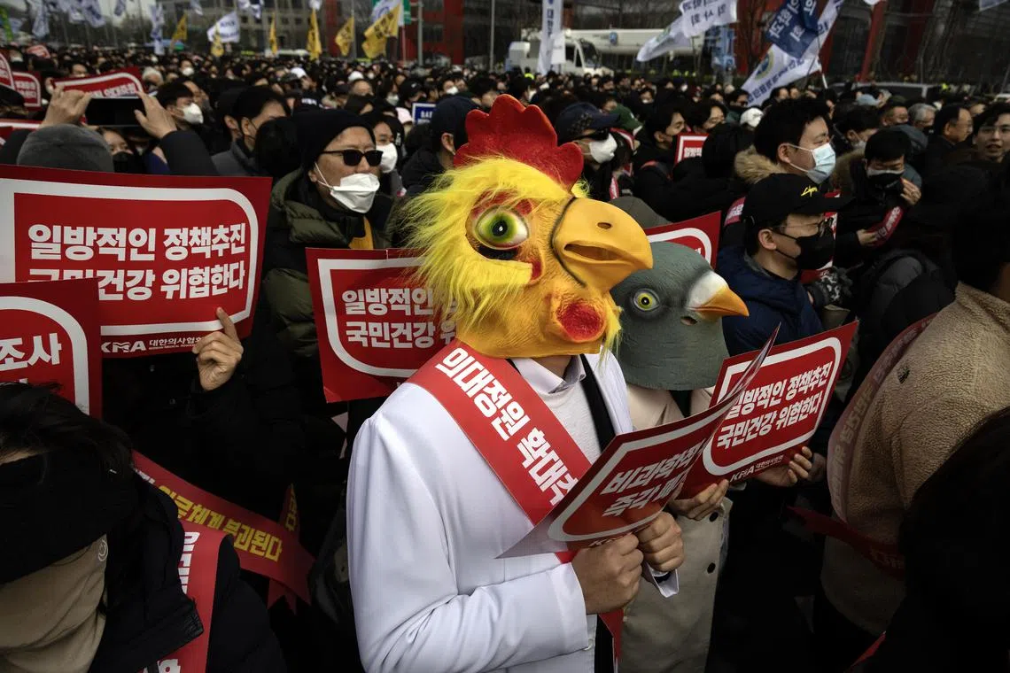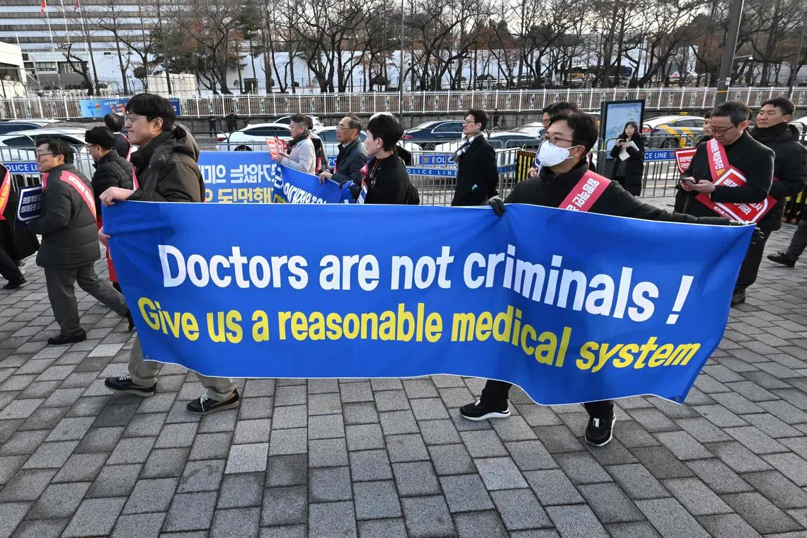 Doctors marching towards the Presidential Office in Seoul on Feb 25 during a rally to protest against the government’s plan to raise the annual enrolment quota at medical schools.