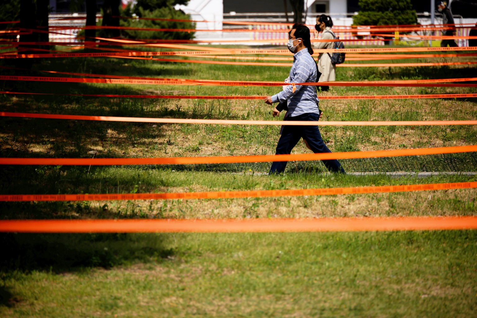 An area in a park in Seoul cordoned off amid the Covid-19 pandemic. Deputy Prime Minister Hong Nam-ki, who also serves as the acting prime minister, said that there is a possibility for the infection risk to be heightened this month when three holidays are celebrated.