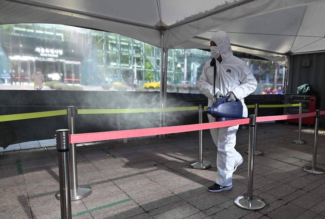 A health worker sprays disinfectant at a temporary Covid-19 testing centre in Seoul on Dec 1, 2021.