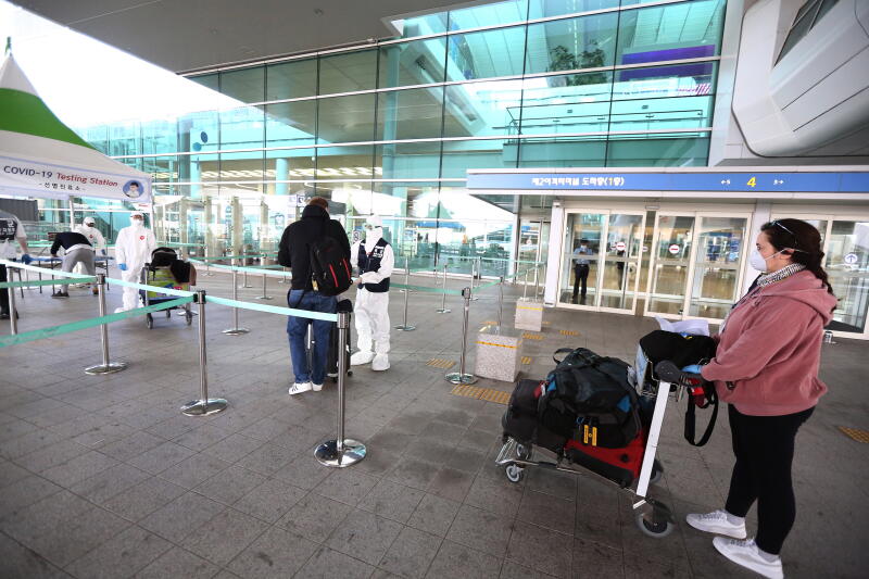 Medical workers taking samples from foreign visitors in South Korea on March 27, 2020.