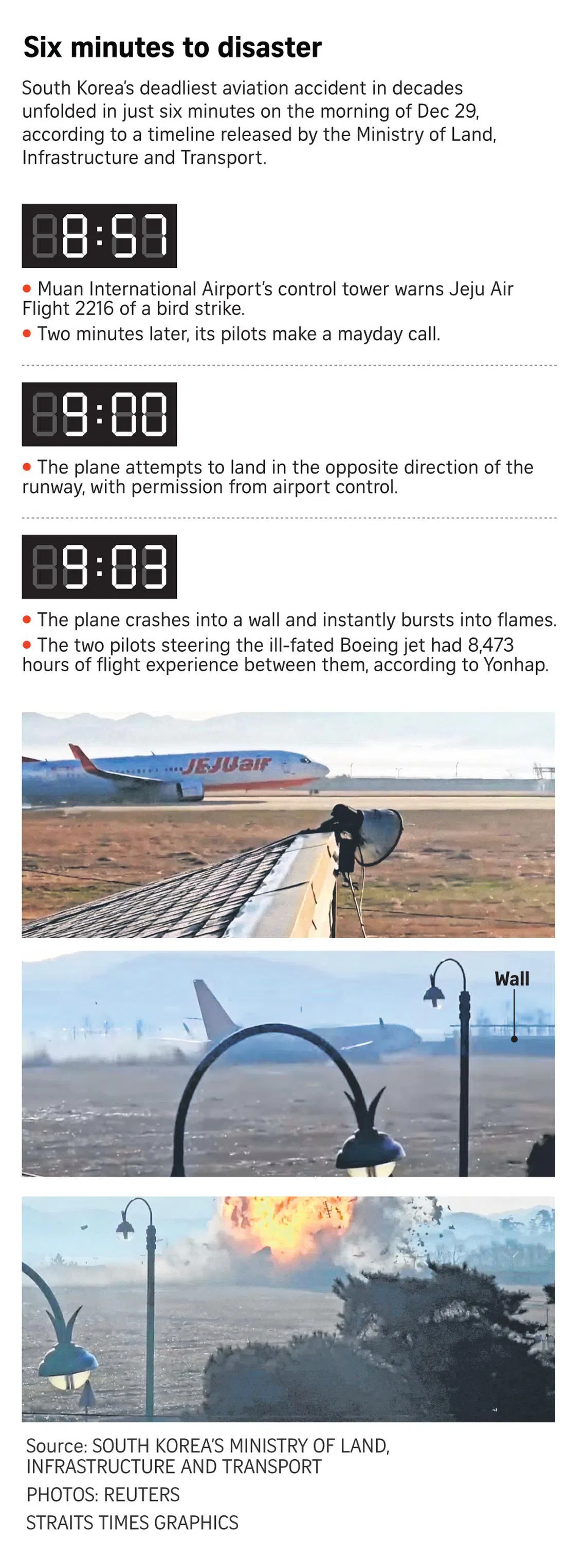 The wreckage of the Jeju Air aircraft lying near a concrete structure it crashed into at Muan International Airport in South Korea, on Dec 30, 2024.