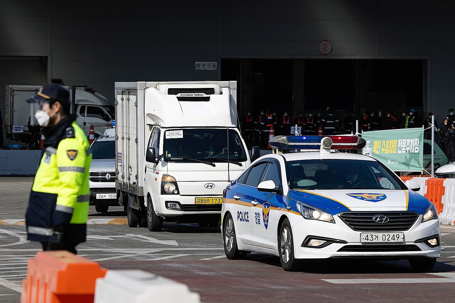 A police convoy escorting a truck carrying the first shipment of Pfizer's Covid-19 vaccine, which arrived at Incheon International Airport yesterday.