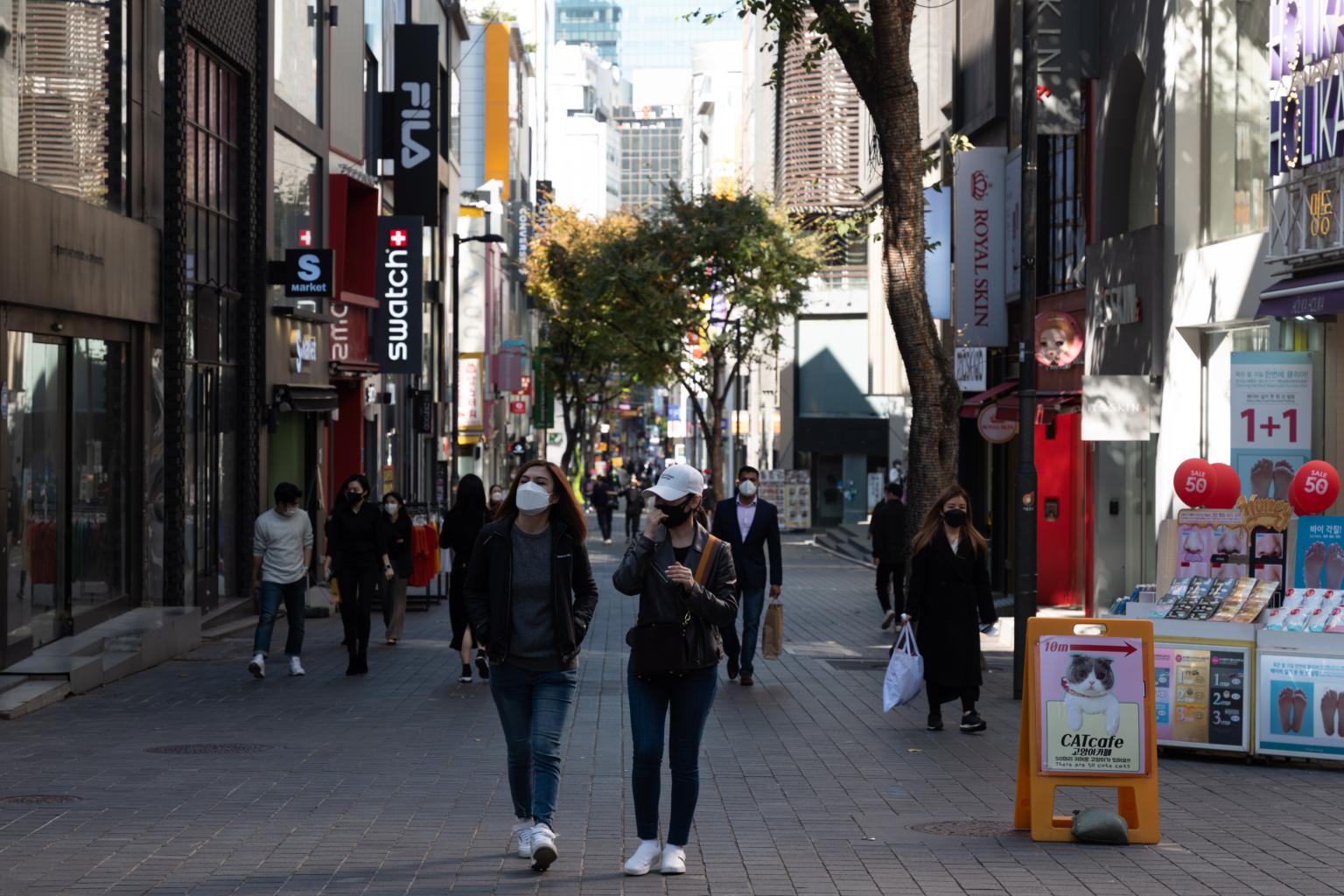 People wearing face masks walk in Myeong-dong street in Seoul on Oct 28, 2021.