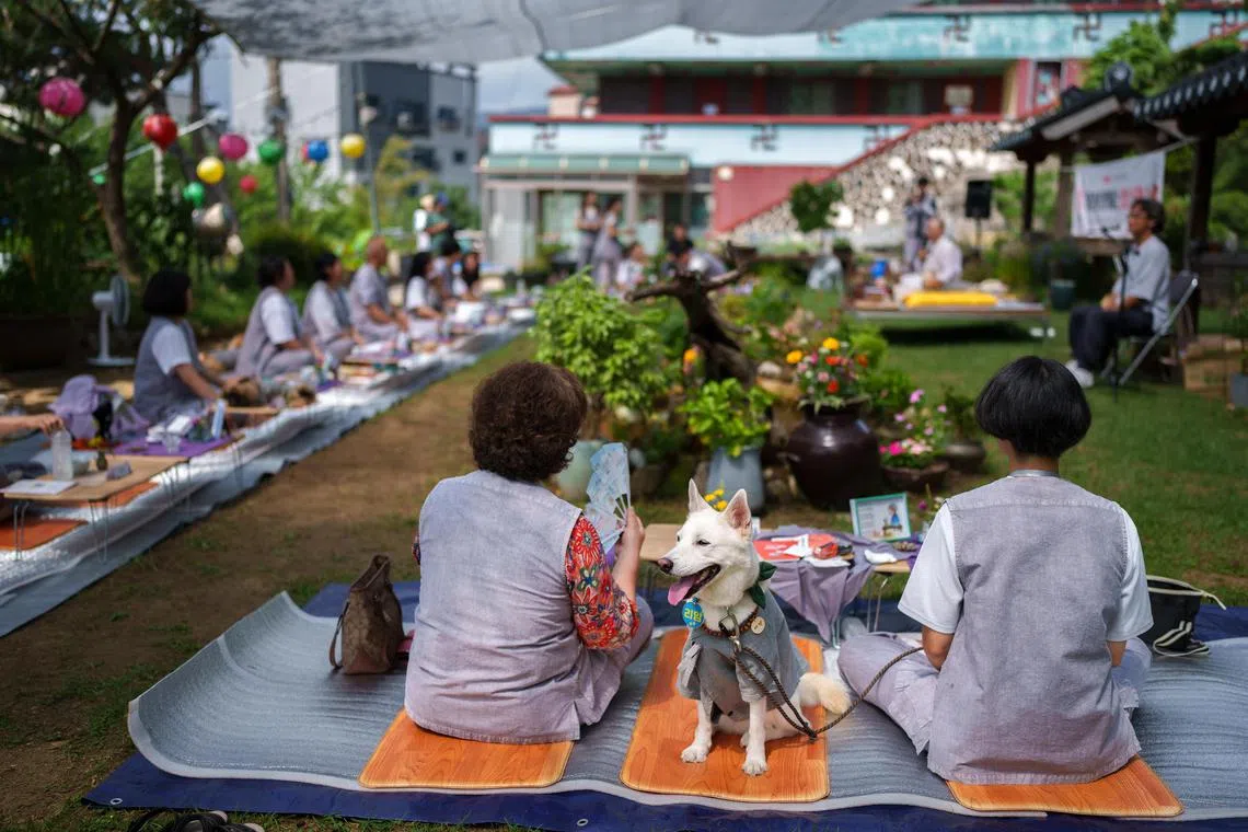Ms Seok Jeong-gak, the head monk of the temple, patted her own dog, Hwaeom, as she preached that humans and dogs were just souls wearing different “shells” in this cycle of life, who may switch shells in their next incarnation.