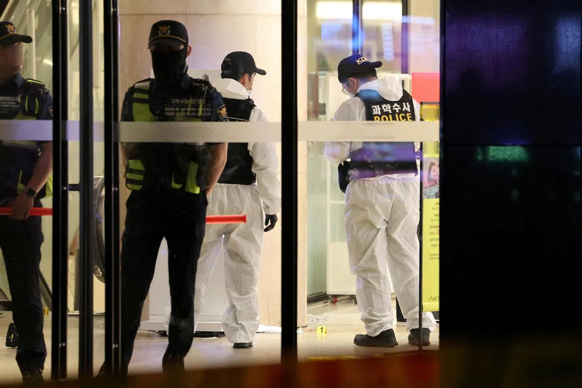 Policemen examine a scene where nine people were stabbed and four others hurt by a car driven by the suspected attacker in Seongnam, South Korea, in Aug 3, 2023.