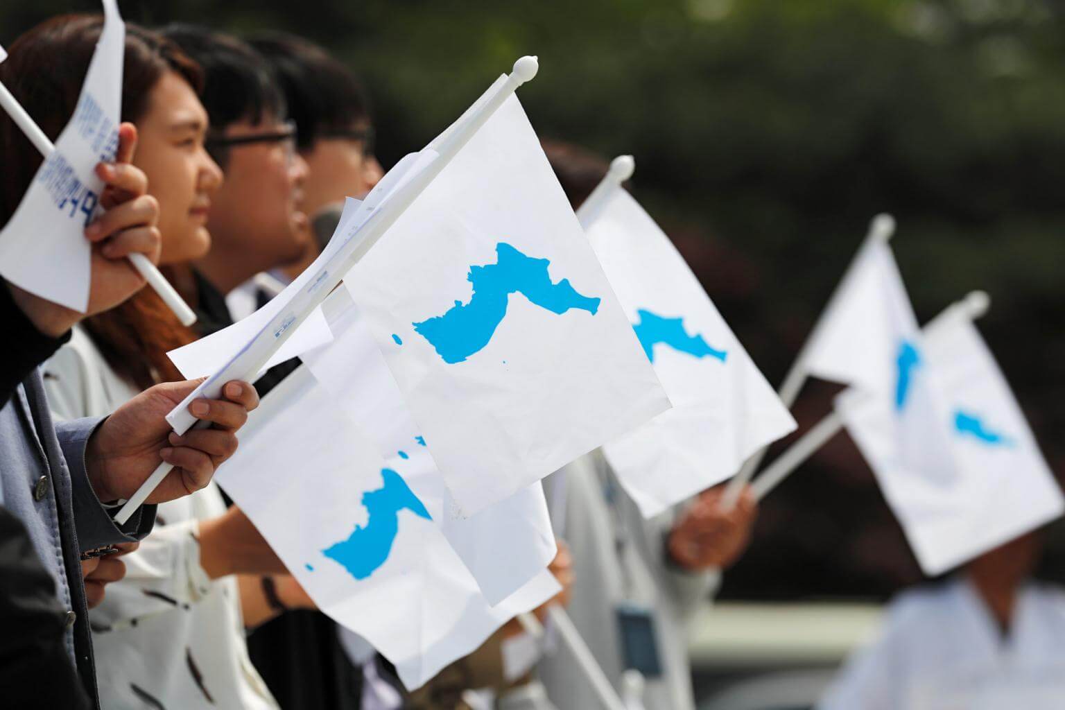Students hold Korean Unification Flags during a pro-unification rally in Seoul, South Korea, on April 26, 2018.