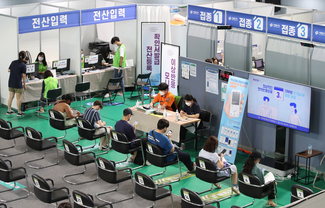 People waiting to get vaccinated against Covid-19 at an inoculation centre in Seoul on Aug 11, 2021.