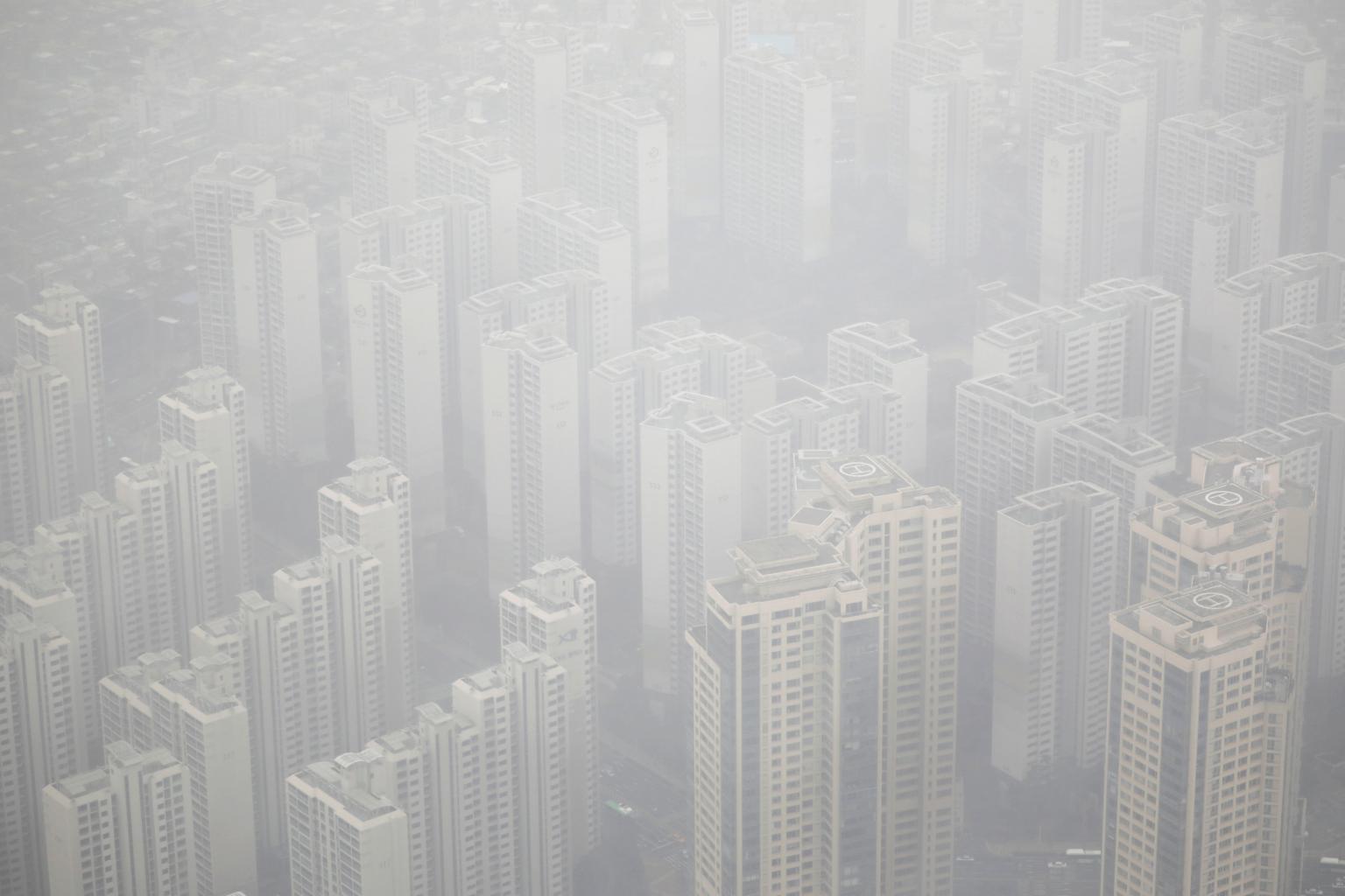 Apartment complexes are seen shrouded by fine dust during a polluted day in Seoul, South Korea on March 6, 2019.