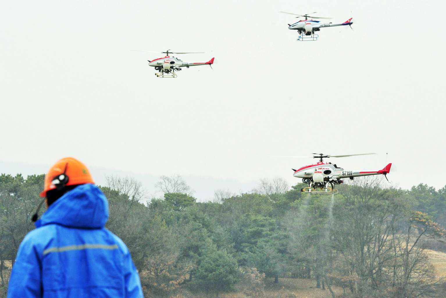 Unmanned aerial vehicles spray a disinfectant over a habitat for migratory birds in Icheon, east of Seoul, 14 Dec, 2016.