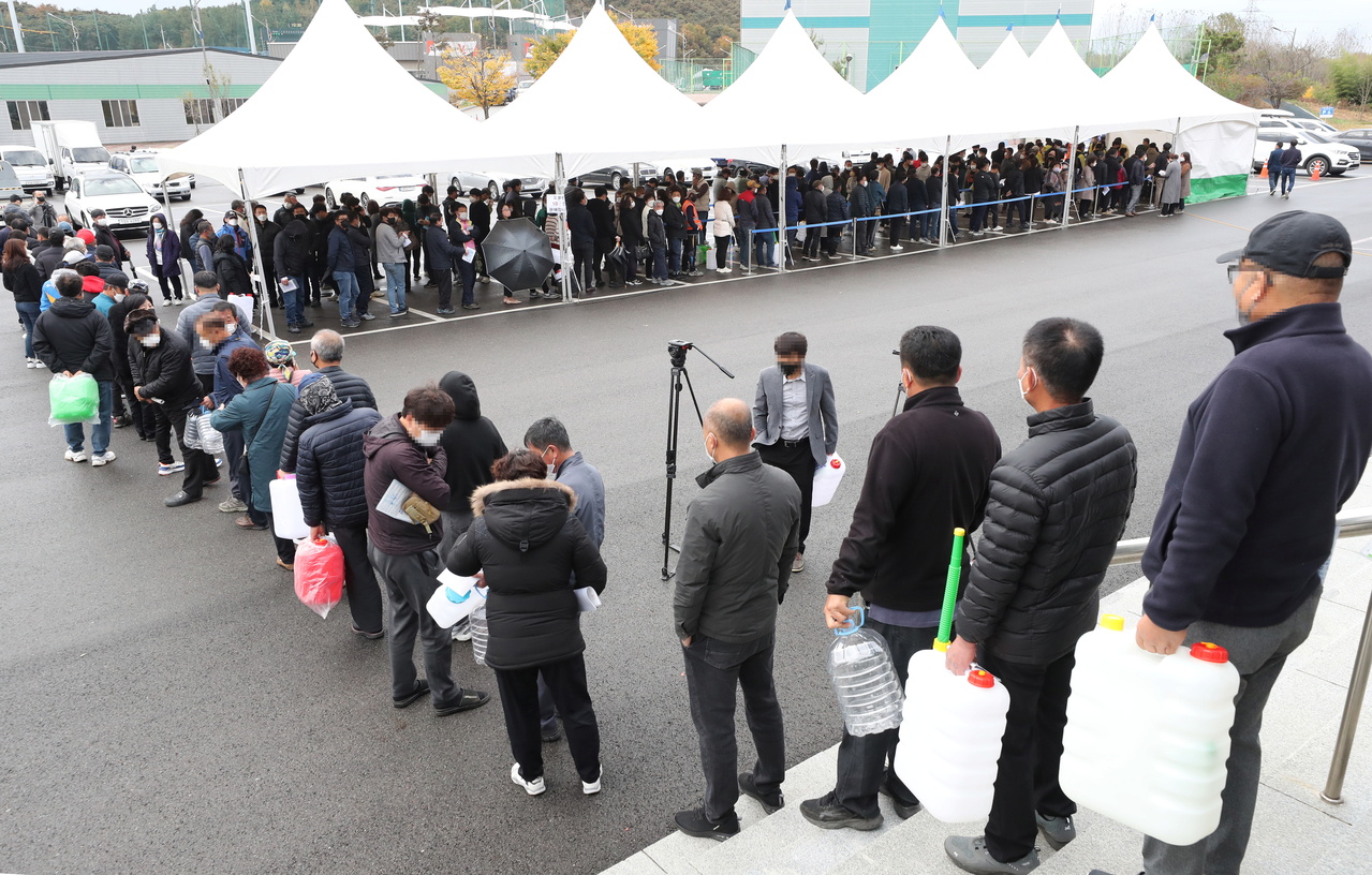 People wait in a line to get urea in Iksan, South Korea, on Nov 9, 2021.