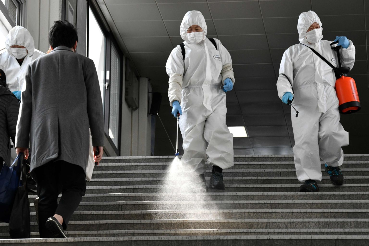 Workers in protective gear spray disinfectant to help prevent the spread of the Covid-19 coronavirus, at a subway station in Seoul, on March 13, 2020.