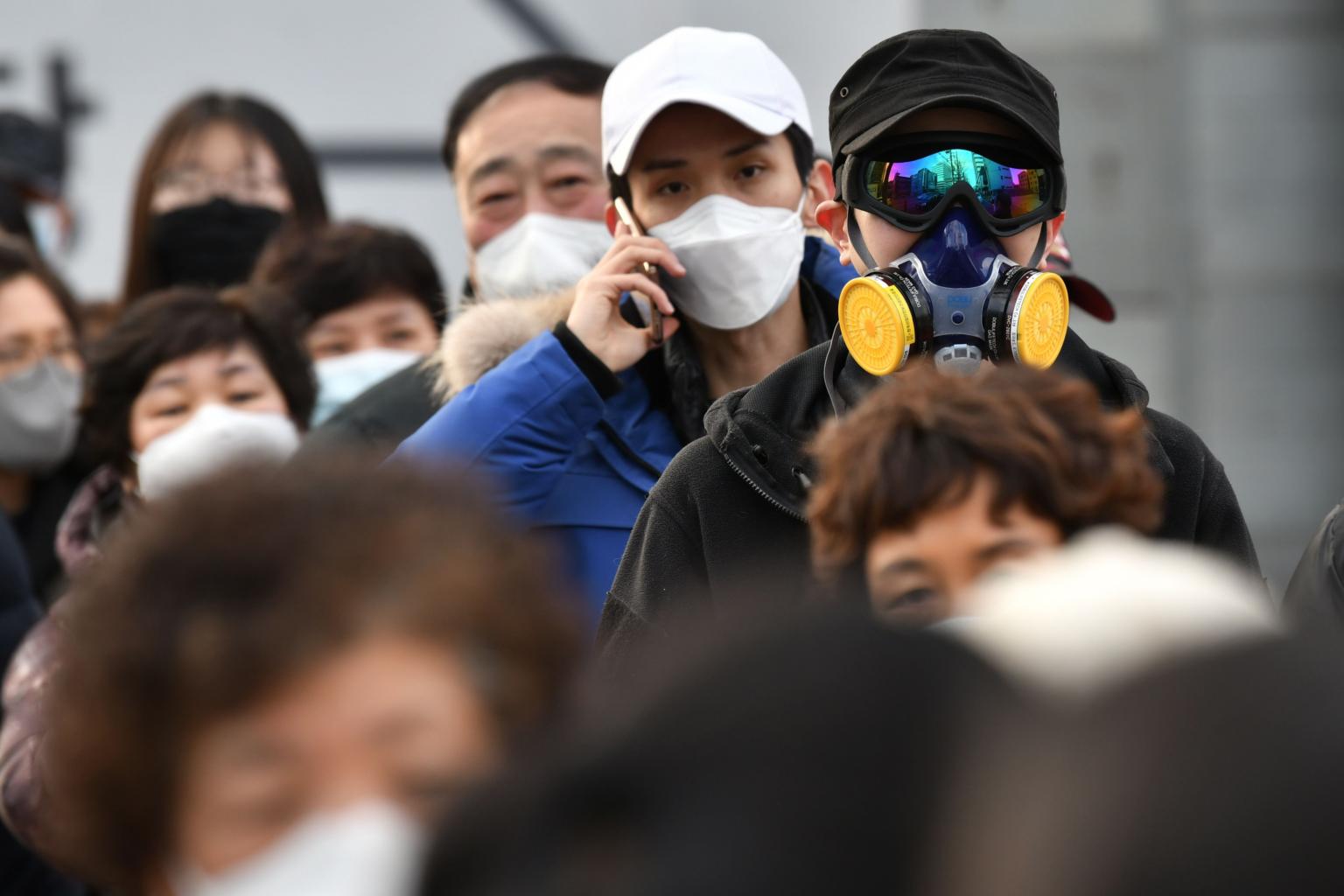 A man wears a mask and goggles as he waits in line to buy face masks from a post office near the Daegu branch of the Shincheonji Church of Jesus in Daegu on Feb 27, 2020.