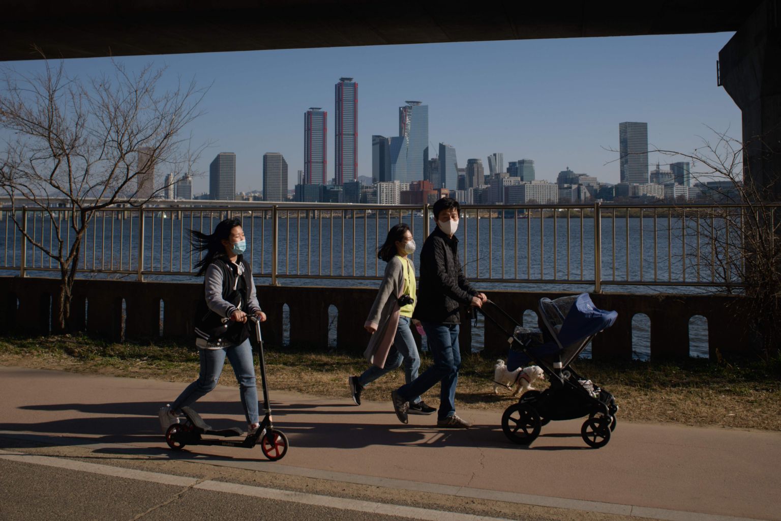 A family wearing face masks walk along the Han river in Seoul on March 22, 2020.
