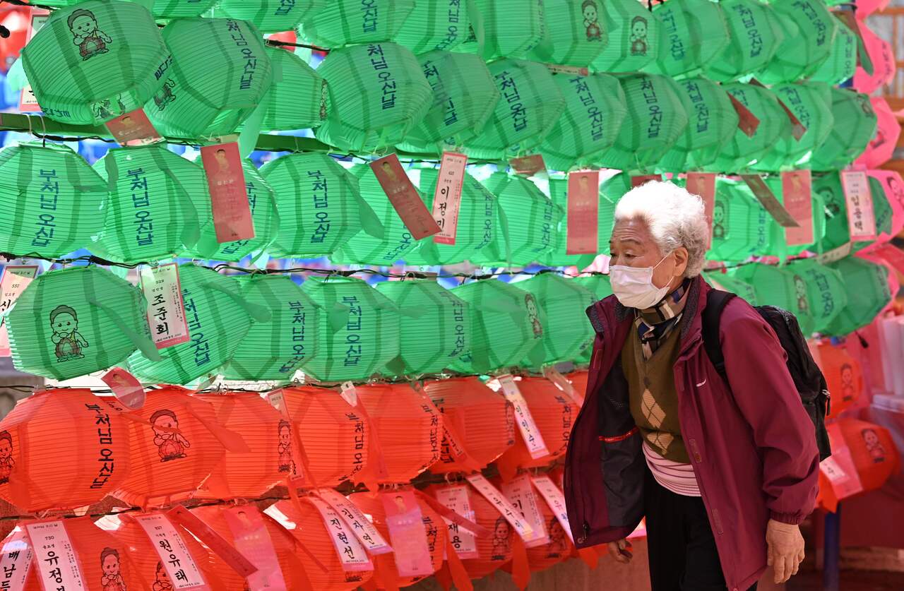 An elderly woman wearing a face mask walks past lotus lanterns ahead of Buddha's birthday at Jogyesa Temple in Seoul, South Korea, on March 23, 2020.