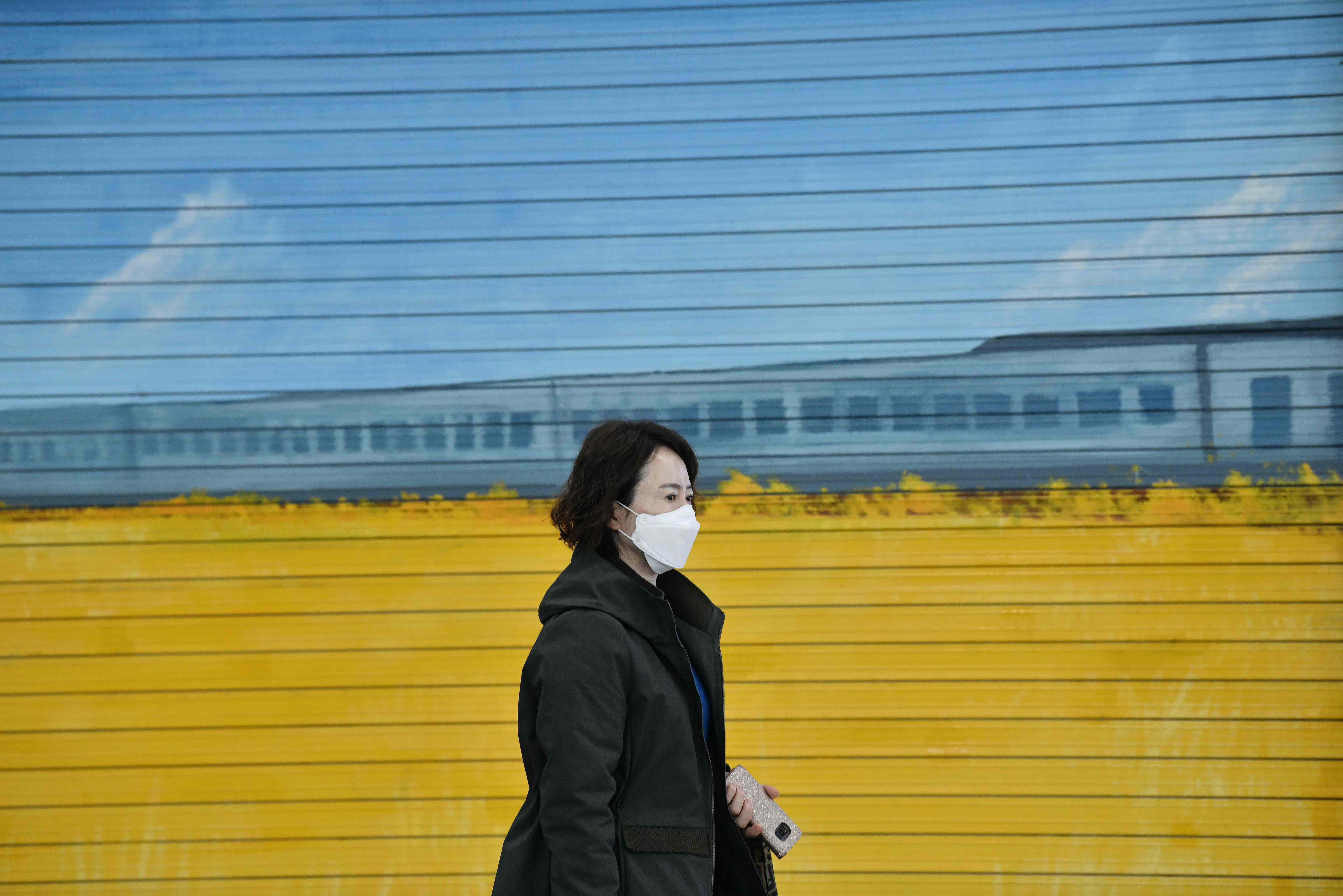 A woman wearing a face mask walks past a wall painting at a railway station in Seoul, South Korea, on March 21, 2020.