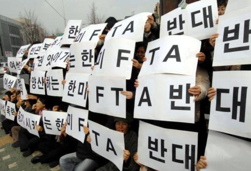 South Korean protesters hold papers that reads "No to FTA between South Korea and the United States" during a demonstration near the presidential office in Seoul on March 9, 2007.