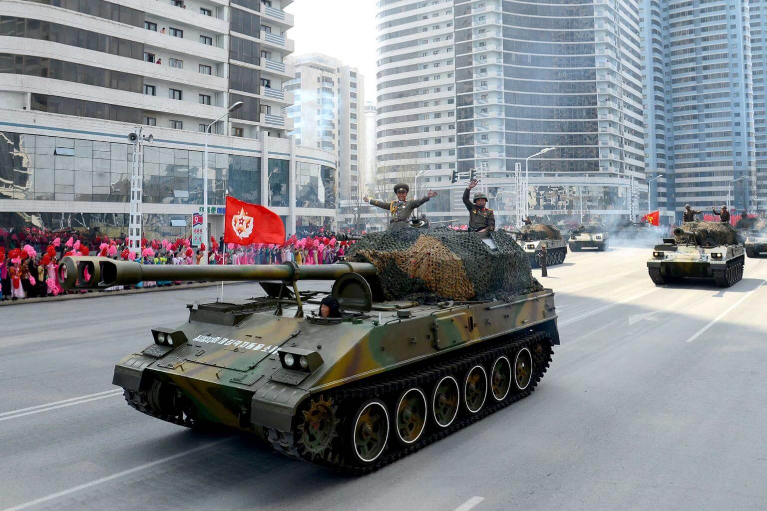 Korean People's Army (KPA) personnel waving after a military parade in Pyongyang on April 15, 2017.