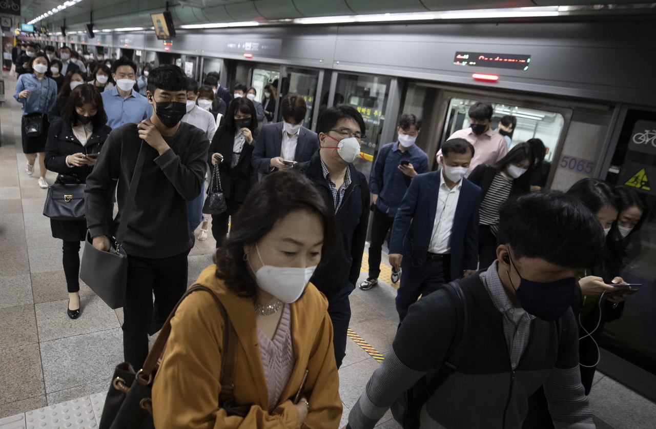 Commuters at a subway station in Seoul, South Korea, on May 13, 2020.