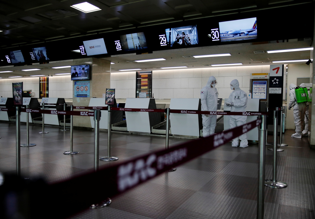 South Korean soldiers carry out disinfection work at the international airport amid the rise in confirmed coronavirus cases in the south-eastern city of Daegu, on March 6, 2020.
