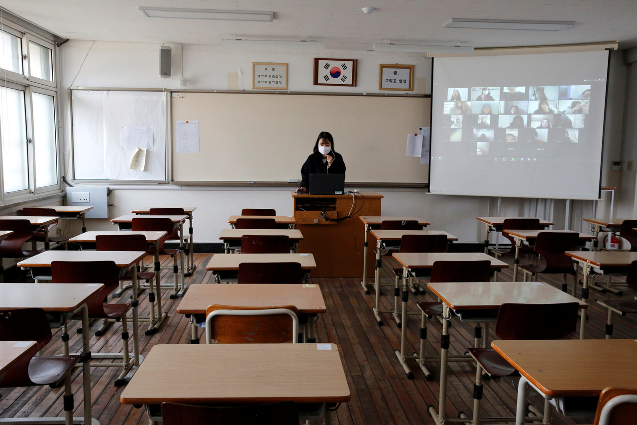 A teacher conducting an online class at a school in Seoul on April 9, 2020.