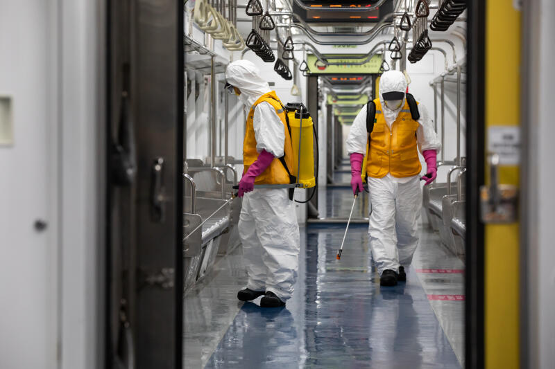 Workers wearing protective suits and masks spray disinfectant inside a Seoul Metro subway train during disinfection operations in Seoul, South Korea, on March 11, 2020.