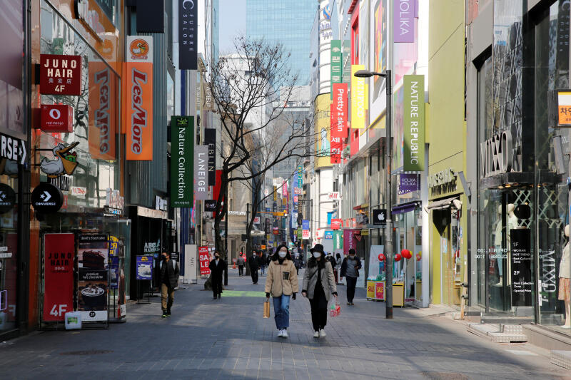 A photo taken on March 23, 2020 shows people with masks in a shopping district in Seoul.