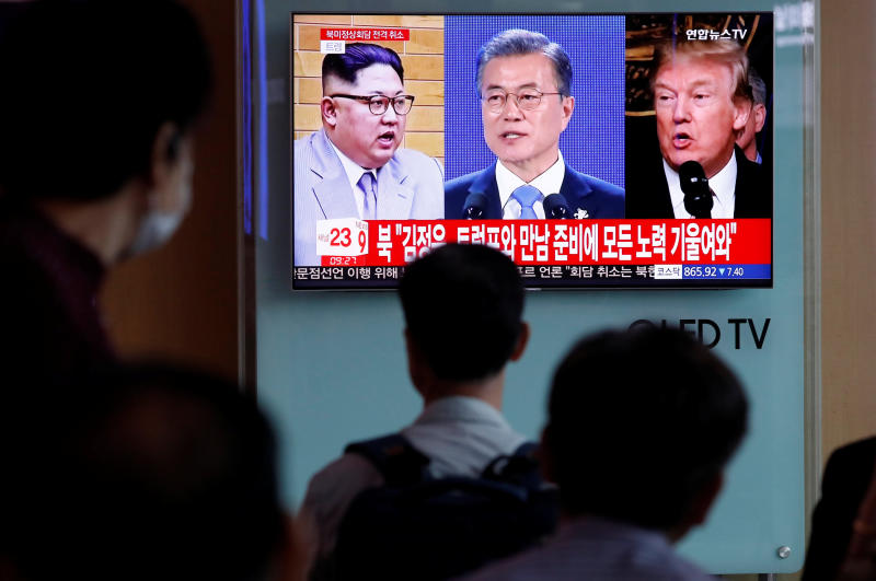 People watching a news report on the summit between the US and North Korea, in Seoul, South Korea, on May 25, 2018.