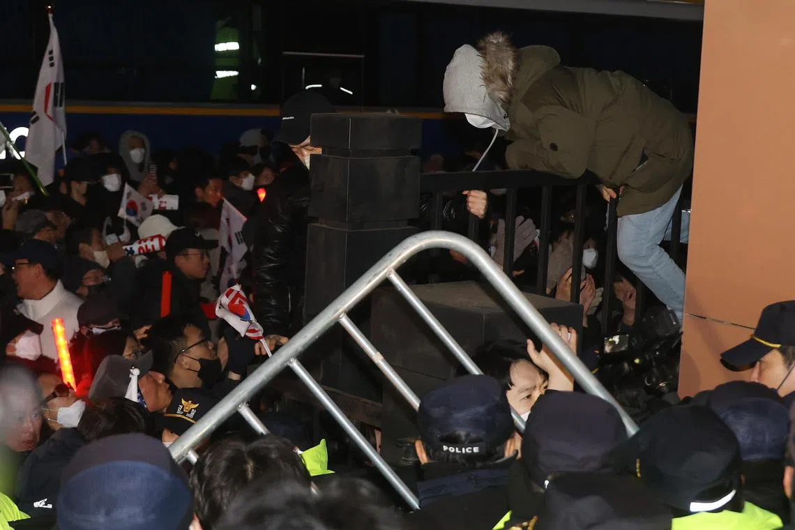 A supporter of impeached South Korean President Yoon Suk Yeol climbing over a fence at the Seoul Western District Court on Jan 18.