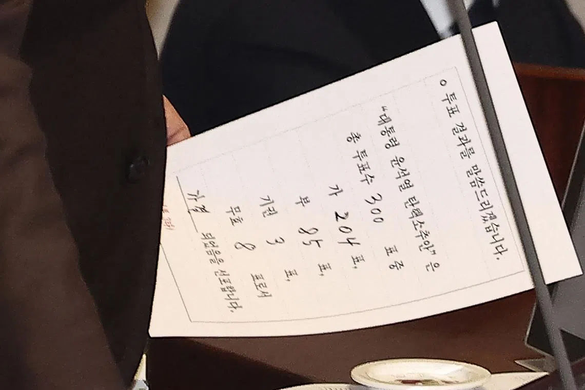 Speaker of the National Assembly Woo Won-shik receiving the results of the vote on the impeachment of South Korean President Yoon Suk Yeol at the plenary session of the National Assembly in Seoul on Dec 14.
