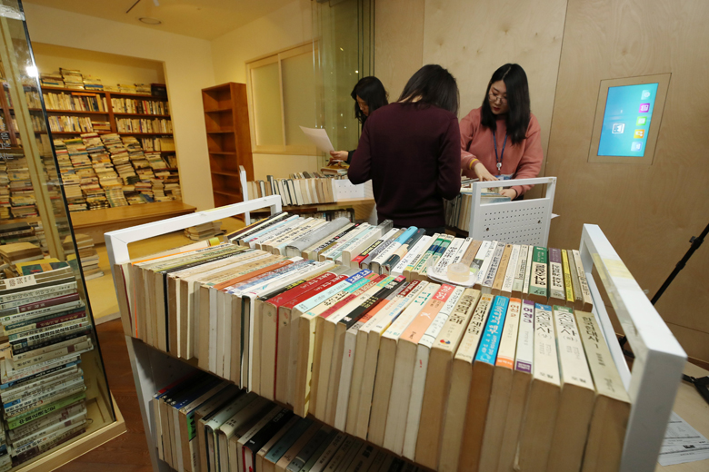 Works by poet South Korean Ko Un are removed from his exclusive exhibit section of the Seoul Metropolitan Library on March 12, 2018.