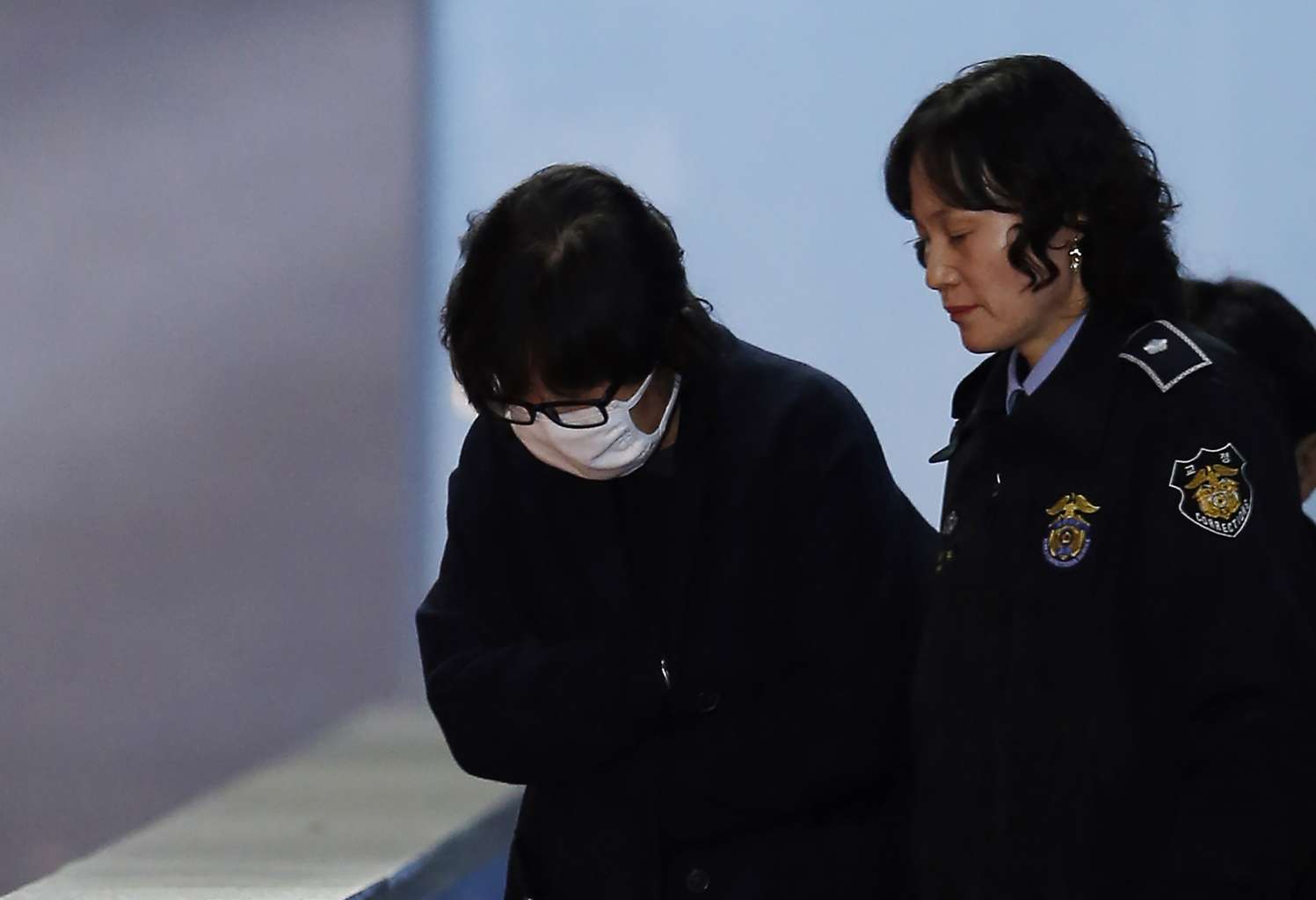 Choi Soon Sil (left) being escorted after her formal arrest, at the Central District Court in Seoul, on Nov 3, 2016.