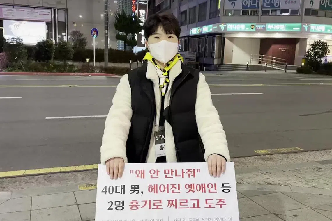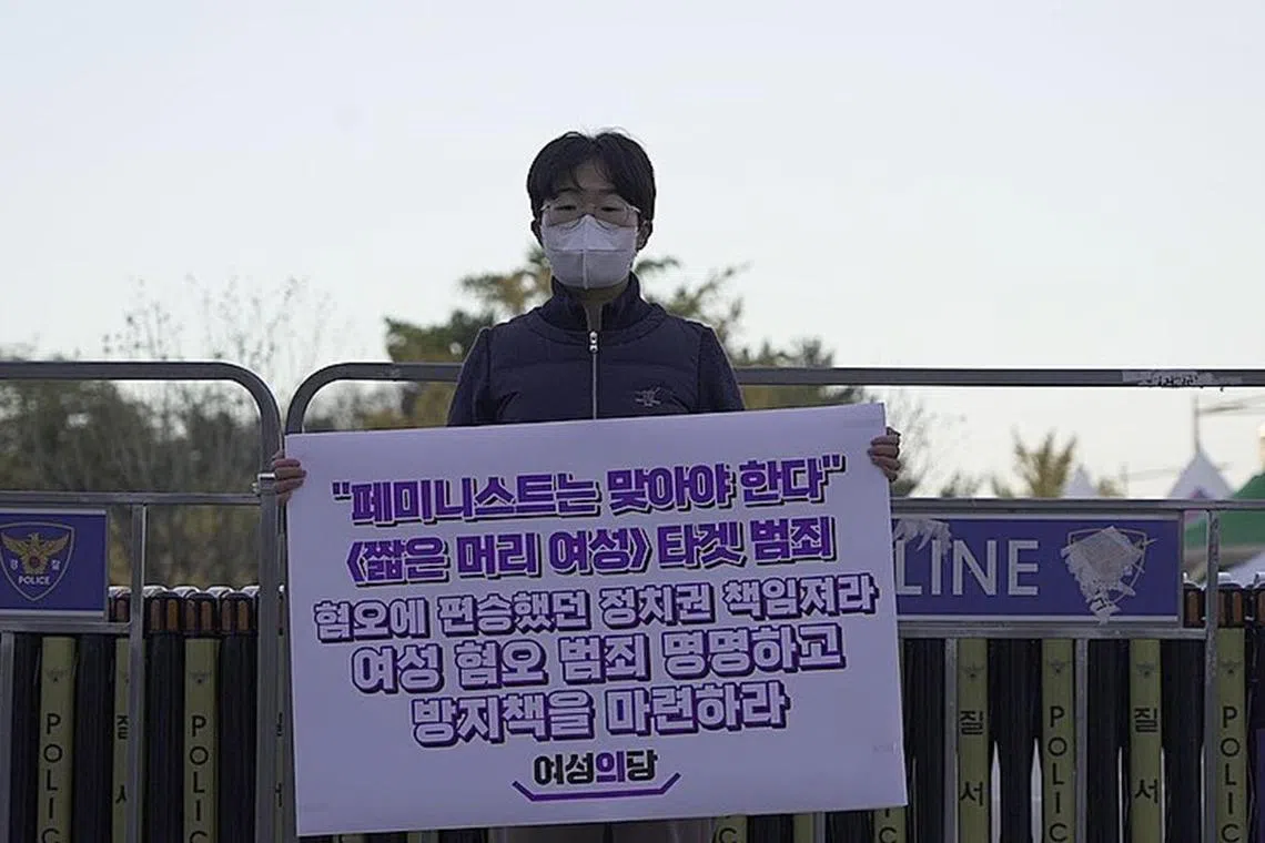 Ms Kim Ju-hee of feminist group Team Haeil did a one-person protest at the National Assembly on Nov 7 after the attack on a convenience store clerk.