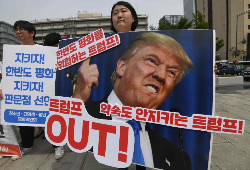 A protester holds a placard showing a picture of US President Donald Trump during an anti-Trump rally near the US embassy in Seoul on May 25, 2018.