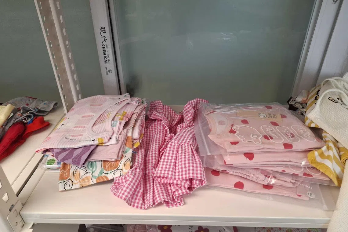 Clothes donated for the babies are neatly arranged at Babybox Korea.