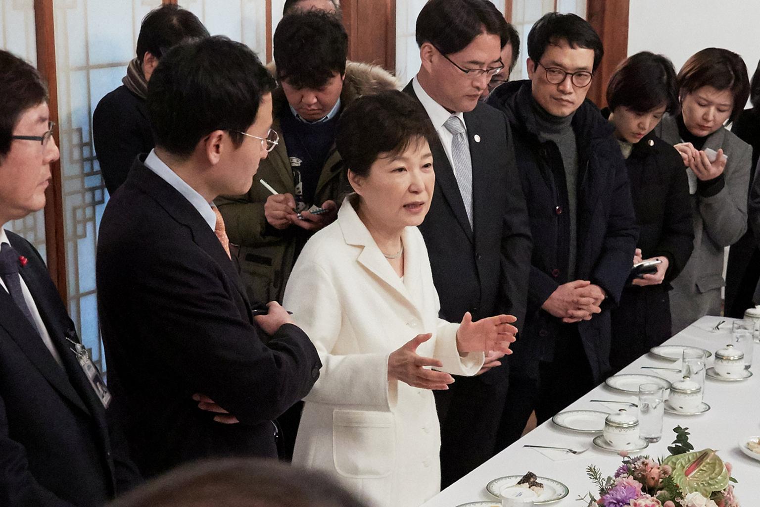 South Korean President Park Geun Hye speaking during a meeting with reporters at the Presidential Blue House in Seoul, South Korea, on Jan 1, 2017.