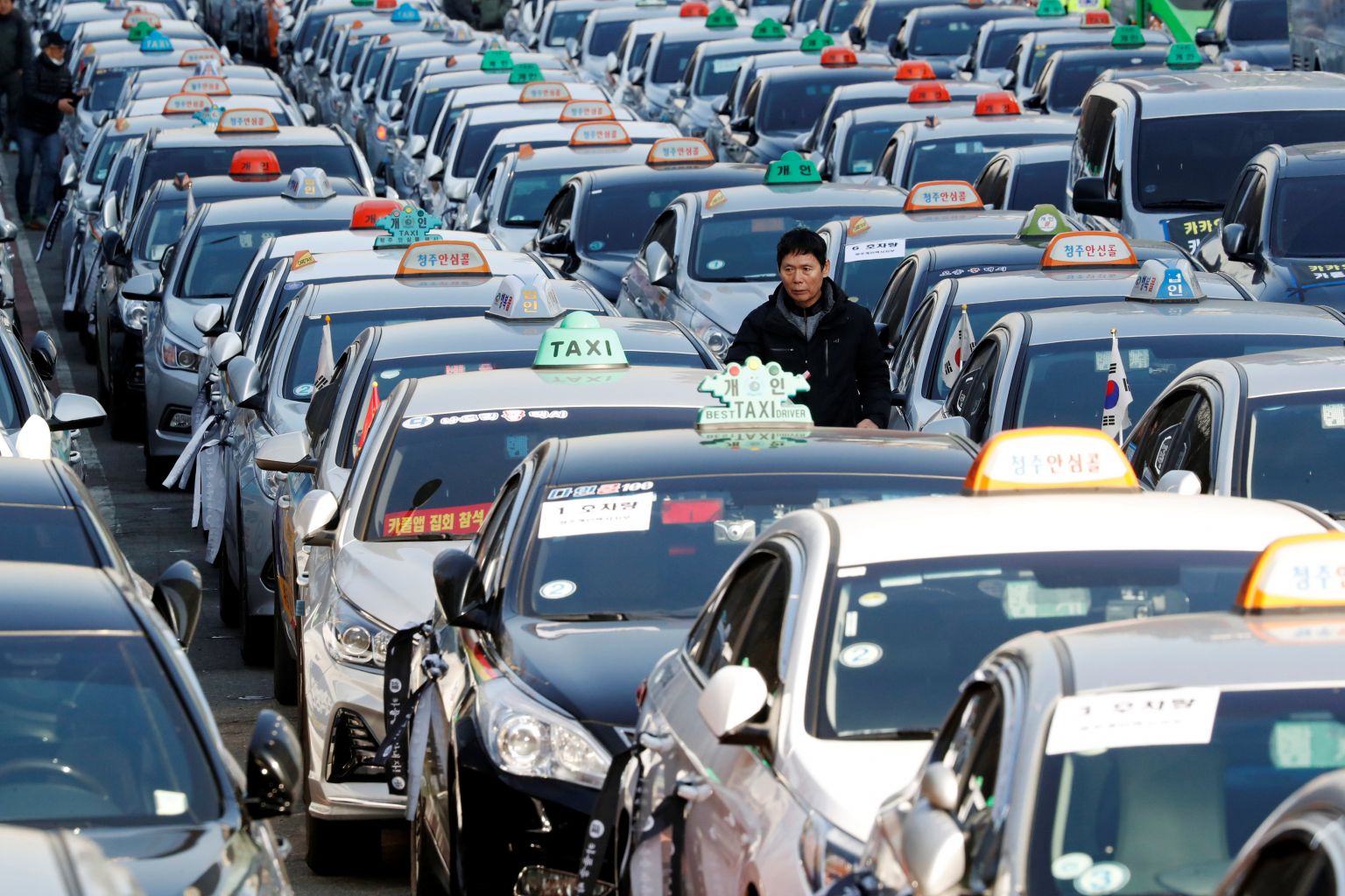 A taxi driver walks amid parked taxis to protest against Kakao Mobility's proposed car-sharing service in Seoul on Dec 20, 2018. Kakao Mobility said it would re-enter talks over its proposed car-sharing service with an open mind, and would even consider abandoning the idea.
