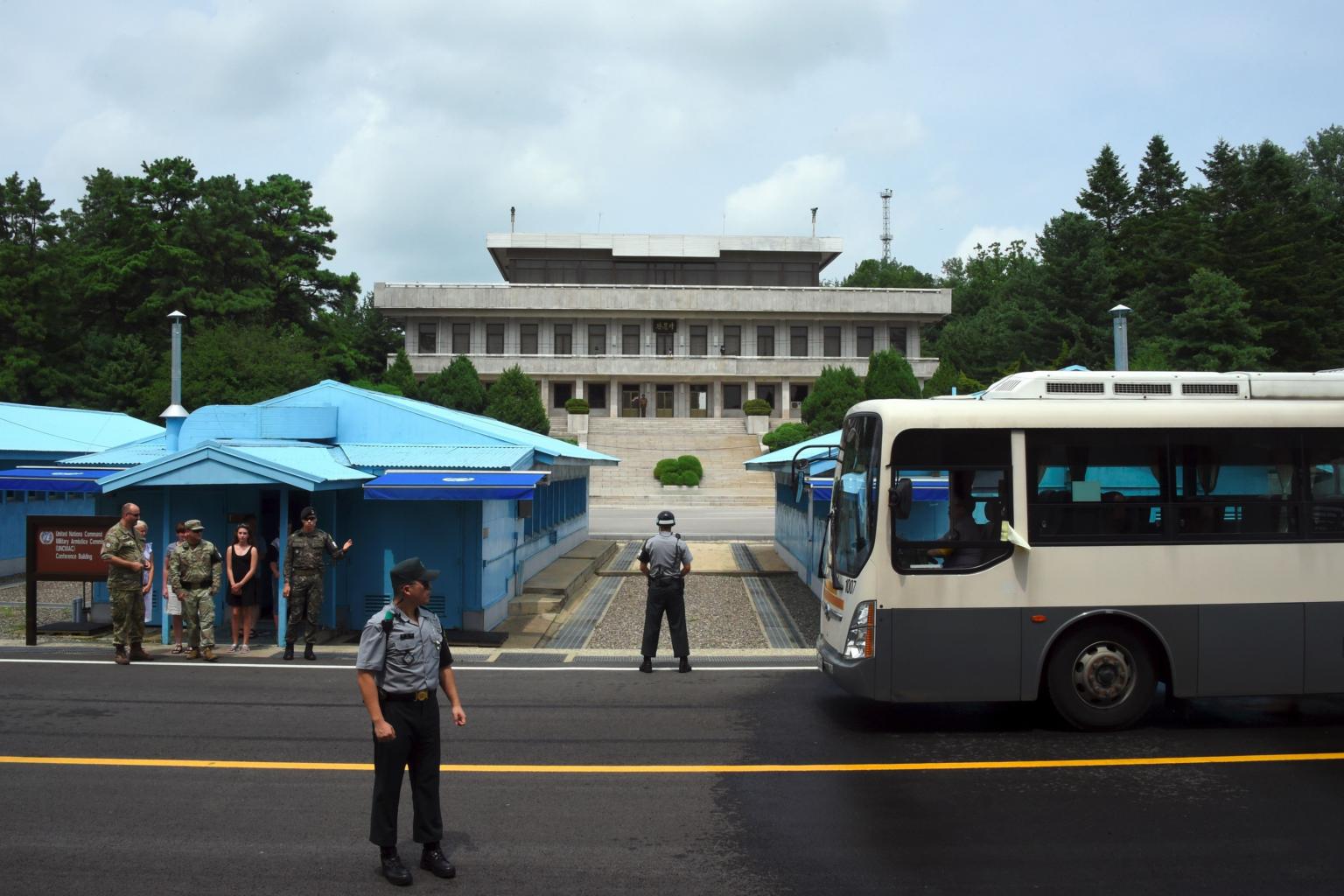 Visitors (left) wait for their bus in front of the UN Command Military Armistice Commission meeting room at the truce village of Panmunjom.