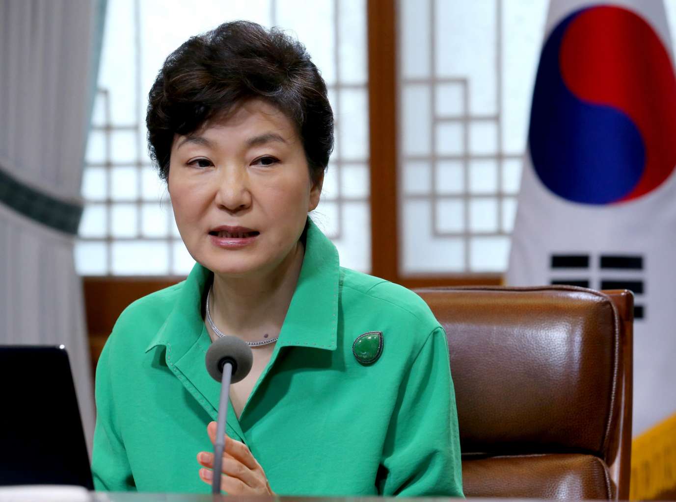 South Korean President Park Geun Hye speaks during a regular meeting with her top aides at the presidential office in Seoul, South Korea, on Aug 10, 2015.