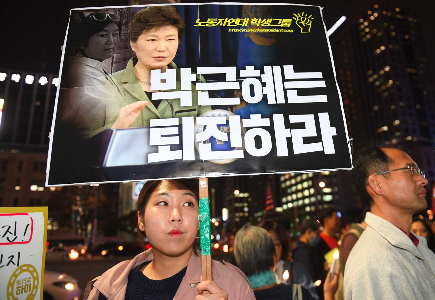 An early banner displayed at the venue for Saturday's rally read "Choi come back, Park get out".