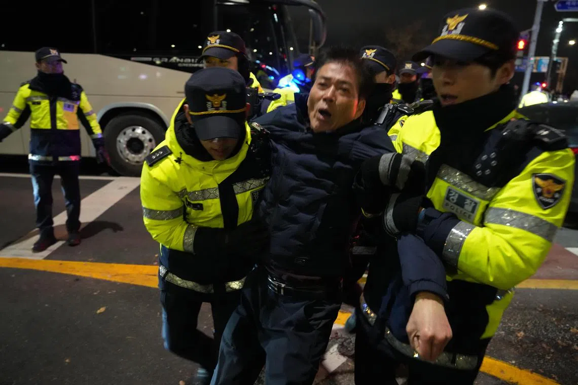 A protester being taken into custody during a rally outside the main gate of the National Assembly building in Seoul, on Dec 3, 2024.